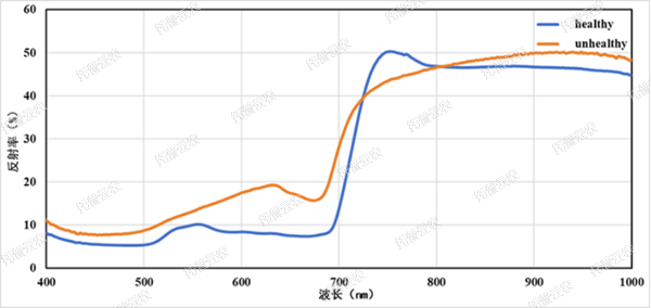 7. 病蟲害分析:可適用于植物病蟲害試驗,進行病斑部分和健康部分光譜反射曲線進行對比,通過對變化趨勢的研究可以對病害發(fā)生部分和嚴重程度進行分析;