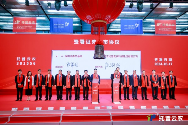 2024年10月17日,隨著深圳證券交易所儀式大廳的鐘聲響起,浙江托普云農(nóng)科技股份有限公司(股票簡稱:托普云農(nóng),股票代碼:301556)正式在深交所創(chuàng)業(yè)板鳴鐘上市!